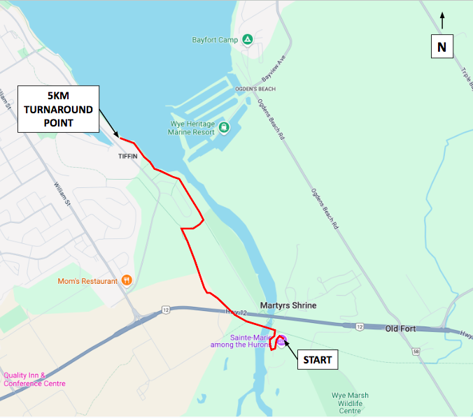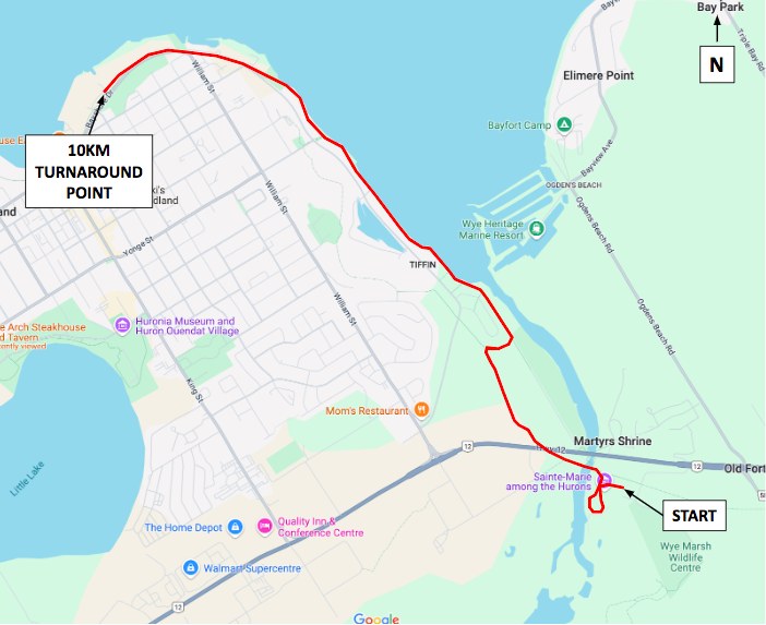 Our 10km trot starts at Sainte Marie Among the Hurons, with the first portion of the route running directly through the historic Sainte Marie site! At the end of the site tour, the route pops onto the Trans Canada Trail that abuts Sainte Marie, where runners will head northwest along the trail which will take them along beautiful Georgian Bay. Runners will run parallel to the Bay as the trail curves around Bayshore Drive, with a turnaround point just before the outskirts of the Butter Tart Festival, where runners will loop back to the finish line following the same route that they took along the Trans Canada Trail after the jaunt through the Sainte Marie site. The start and turnaround points have been marked on our maps.