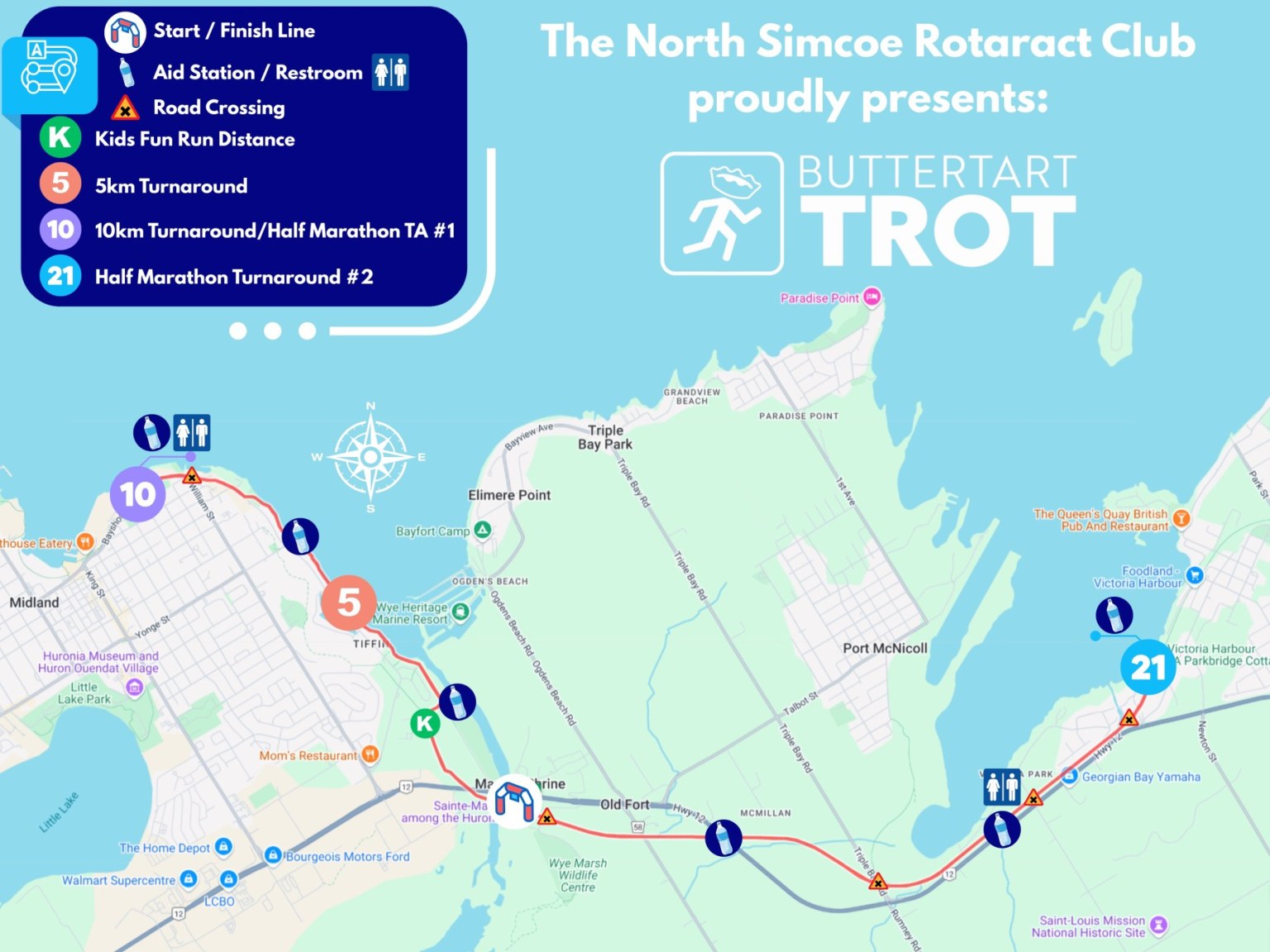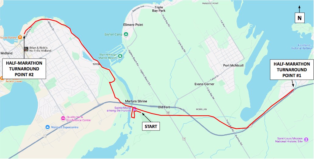 Our half-marathon trot starts at Sainte Marie Among the Hurons, with the first portion of the route running directly through the historic Sainte Marie site! At the end of the site tour, the route pops onto the Trans Canada Trail that abuts Sainte Marie, where runners will head east along the trail which will take them towards Tay Township, where the first turnaround point will be just beyond Victoria Park. After the first turnaround runners will loop back along the Trans Canada Trail and meet beautiful Georgian Bay once they arrive back in the Town of Midland. Runners will continue running parallel to the Bay as the trail curves around Bayshore Drive, with the second turnaround point just before the outskirts of the Butter Tart Festival, where runners will loop back to the finish line following the same route that they took along the Trans Canada Trail after the jaunt through the Sainte Marie site. The start and turnaround points have been marked on our maps.